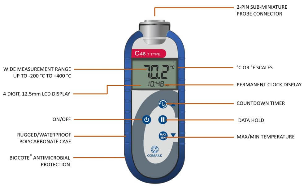 Comark C46 termometer er et robust, vanntett og prisgunstig måleinstrument med termoelement type-T føler og miniplugg tilkobling. Måleområde for temperatur er fra -50 °C til +400 °C og termometret har innebygget klokke, gummibeskyttelse og Biocote antimikrobiologisk beskyttelse for bedre bakteriereduksjon på instrumentet og dens omgivelser.