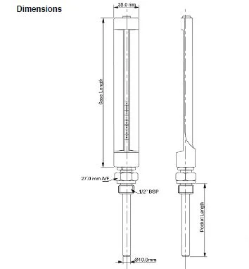 Modellene finnes for måling fra -30 °C opp til +200 °C. Glasstermometeret er godt beskyttet i robust industribeskyttelse og temperaturlommen er i messing, men kan leveres i rustfritt stål ved forespørsel, (kontakt oss). Temperaturmåleren produseres i henhold til DIN 16195 standarden i Storbritannia.